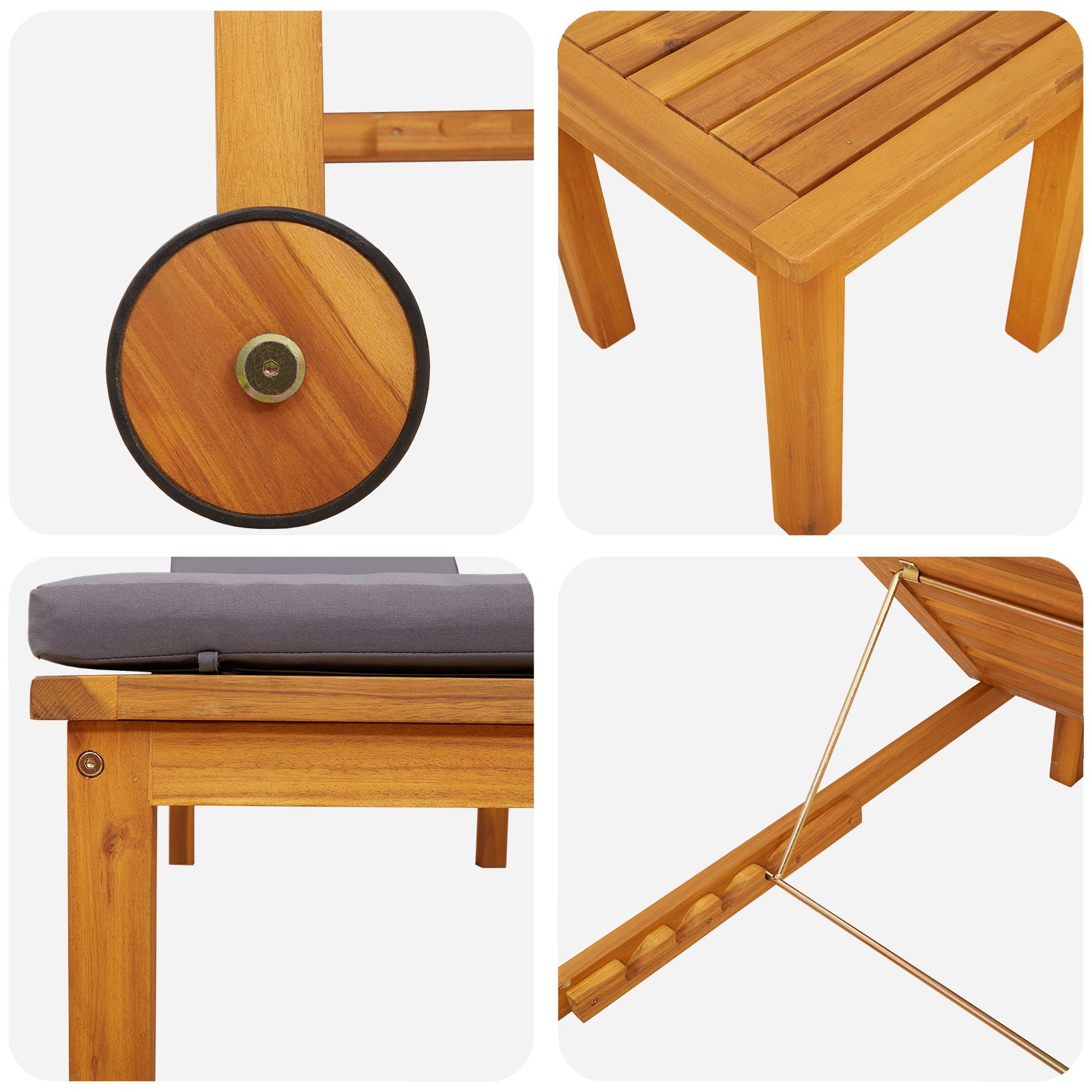 Set de șezlonguri 2 piese cu masă și perne din lemn acacia, Șezlong cu perne gri din lemn acacia, Masă laterală 35x35x34 cm din lemn acacia