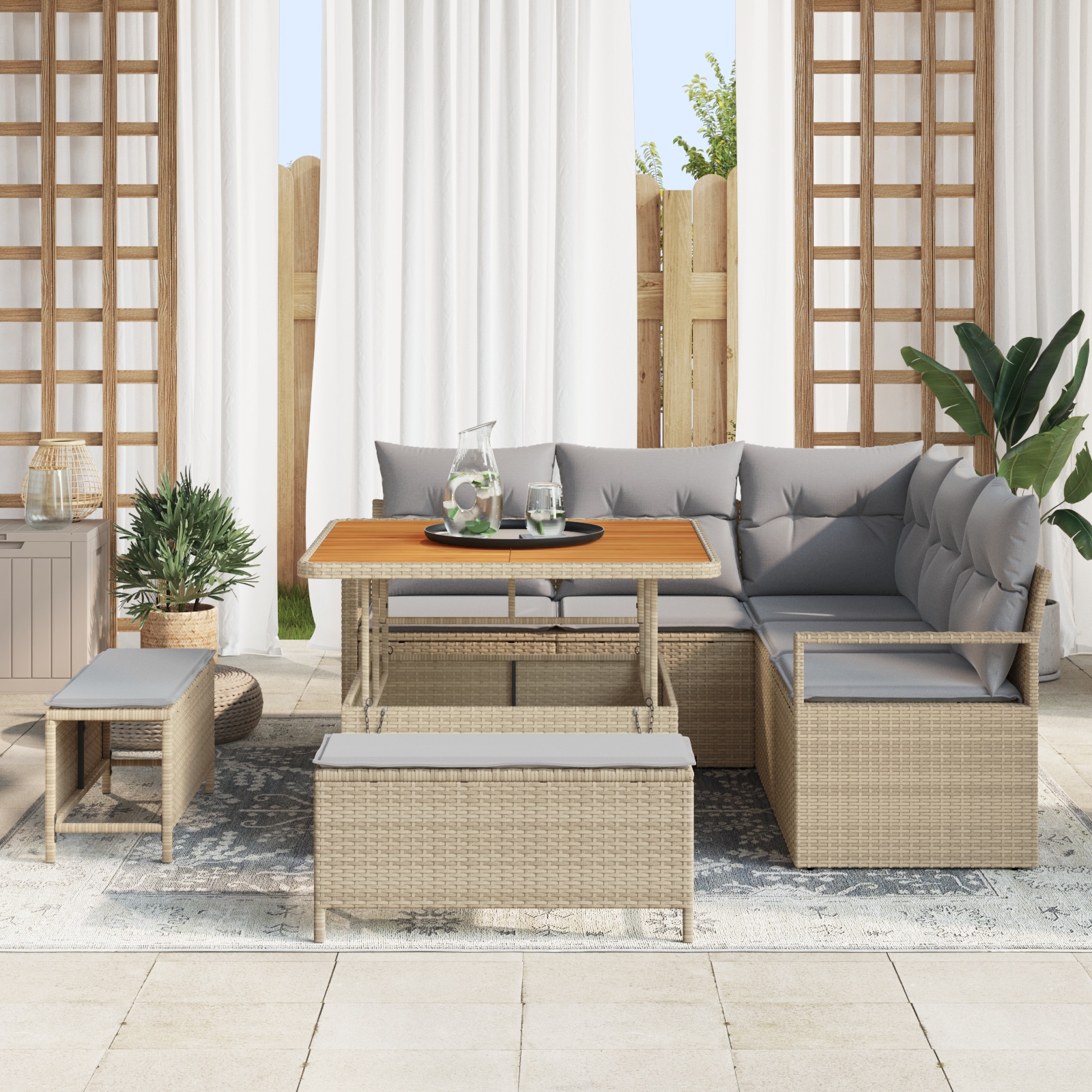 - Utilizări exterioare: Ideal pentru terase, grădini sau balcoane, setul transformă zona ta de afară într-un loc super relaxant pentru cină și chill. Tonurile lui neutre se potrivesc în orice mediu, adăugând un touch elegant. Indiferent că e o ocazie fancy sau o întâlnire casual, se potrivește cu stil.