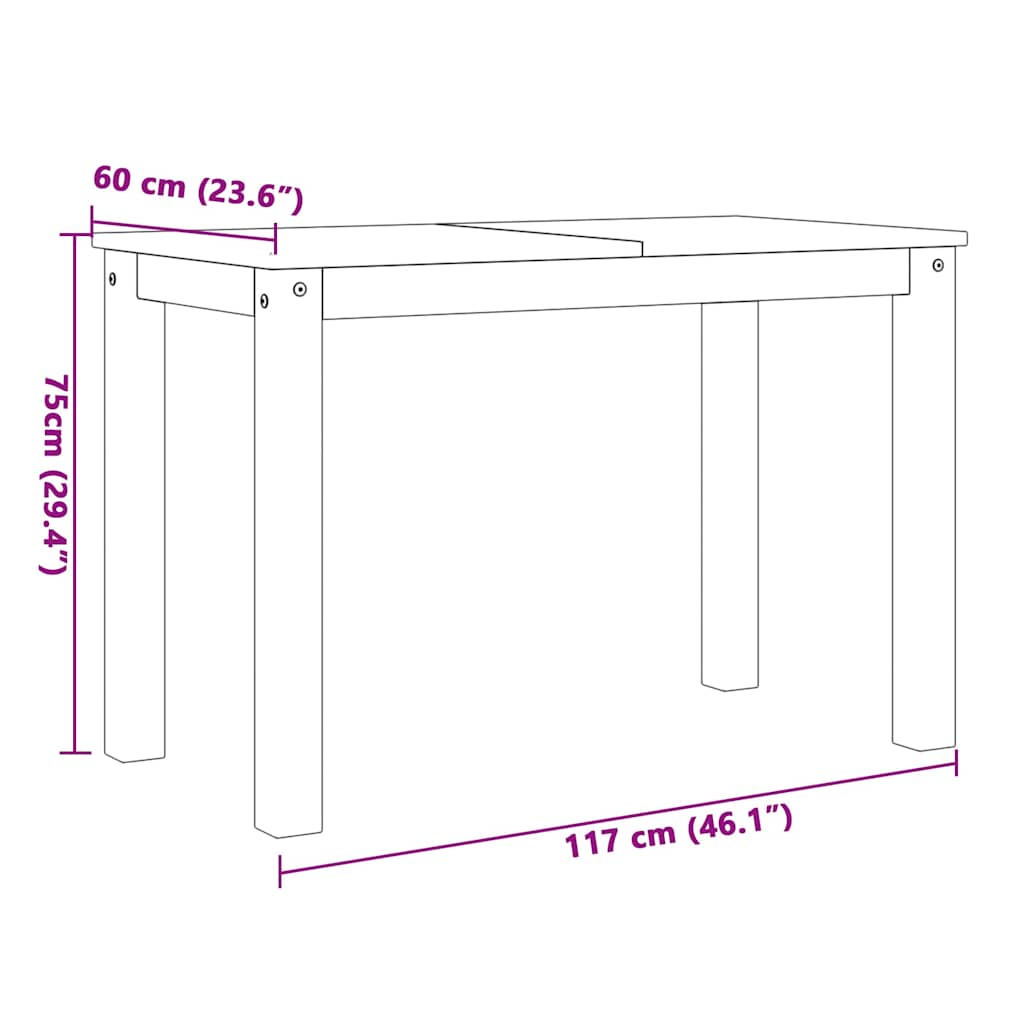 - Dimensiuni masă: 117 x 60 x 75 cm (L x l x H)