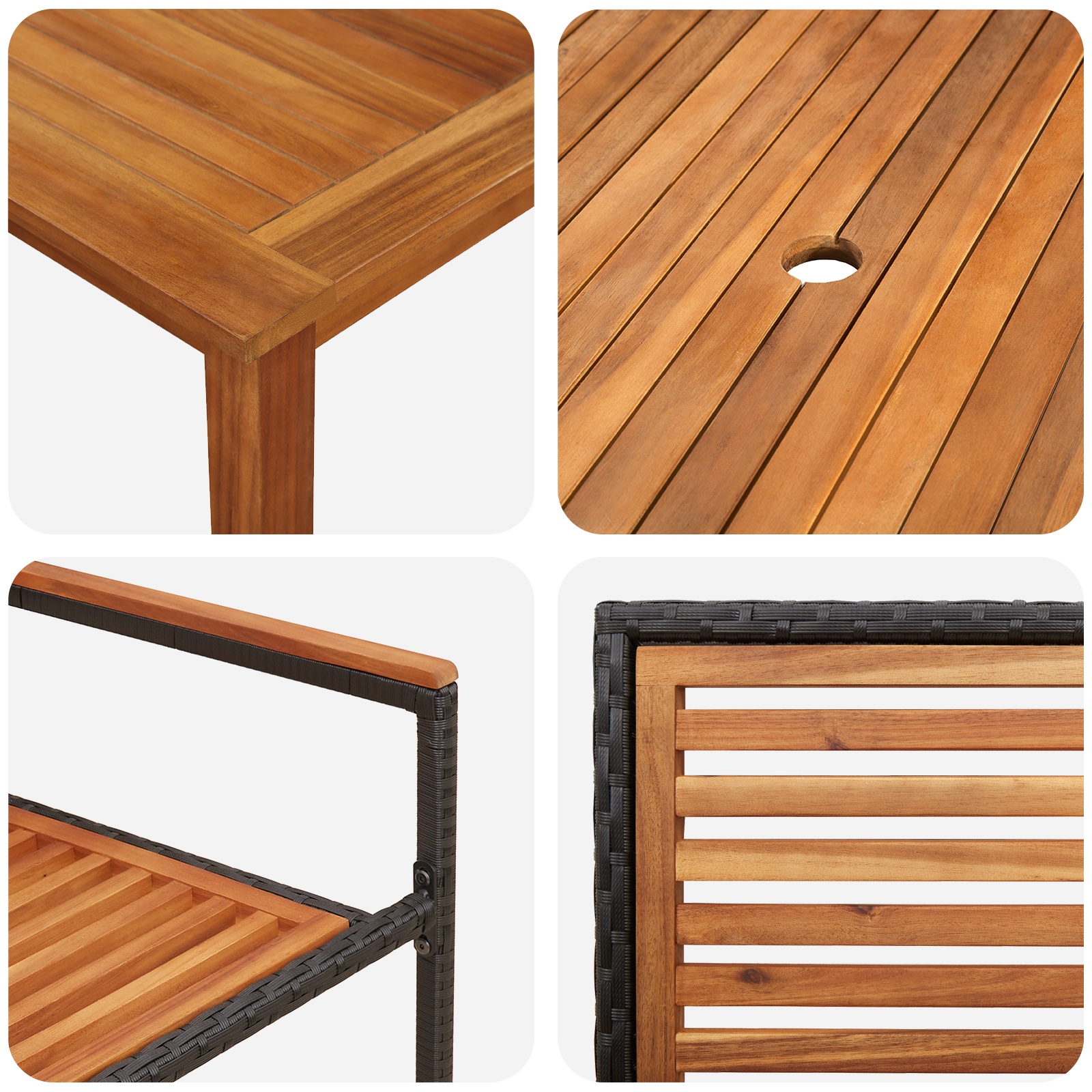 - Materiale: Fabricat din poliratan care rezistă la UV și intemperii. Accentele de lemn îmbunătățesc aspectul, asigurându-te că rămâne robust în diverse condiții meteo, oferind stil fără prea multă întreținere.