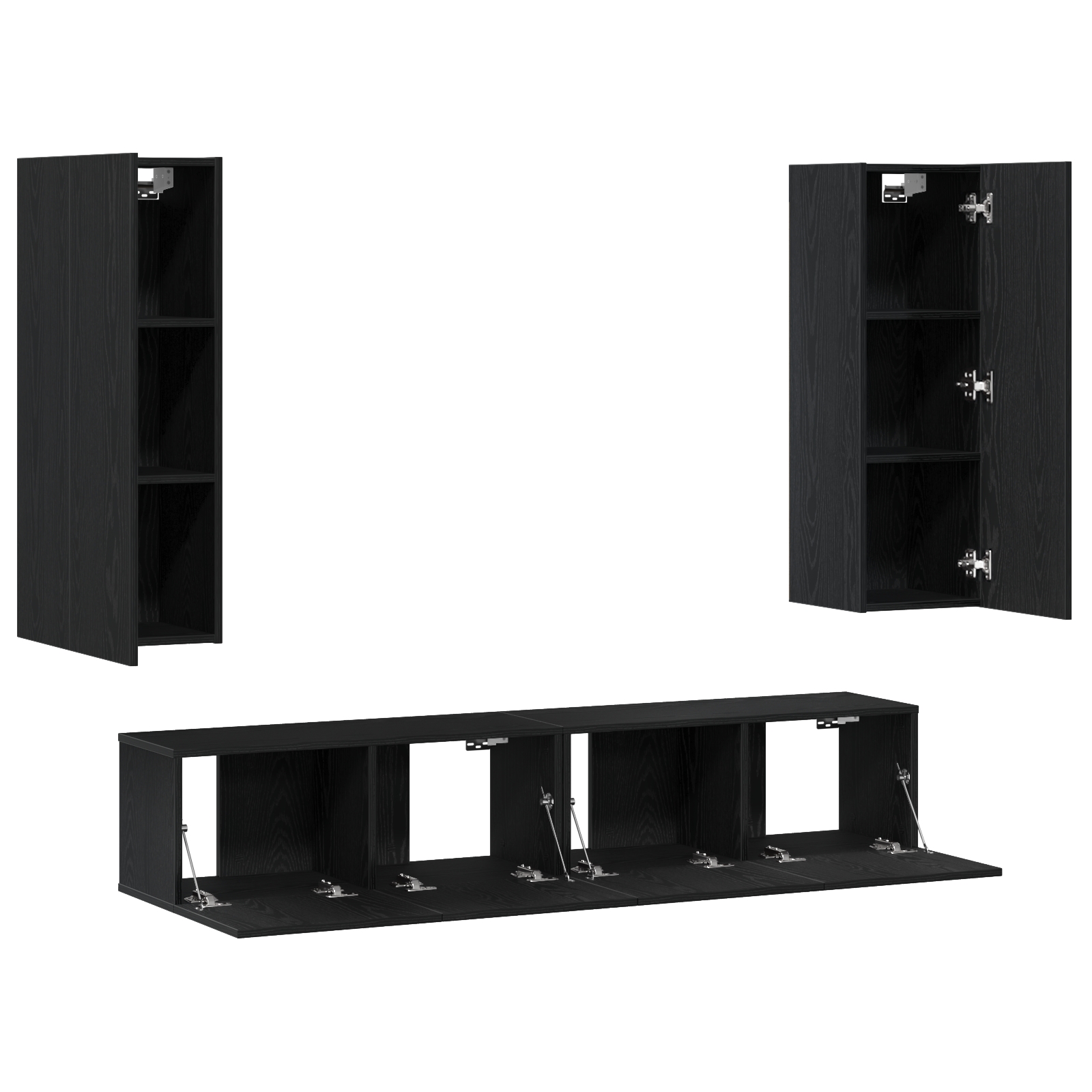 Set de 4 piese pentru cabinet TV montat pe perete Negru Stejar din lemn prelucrat.