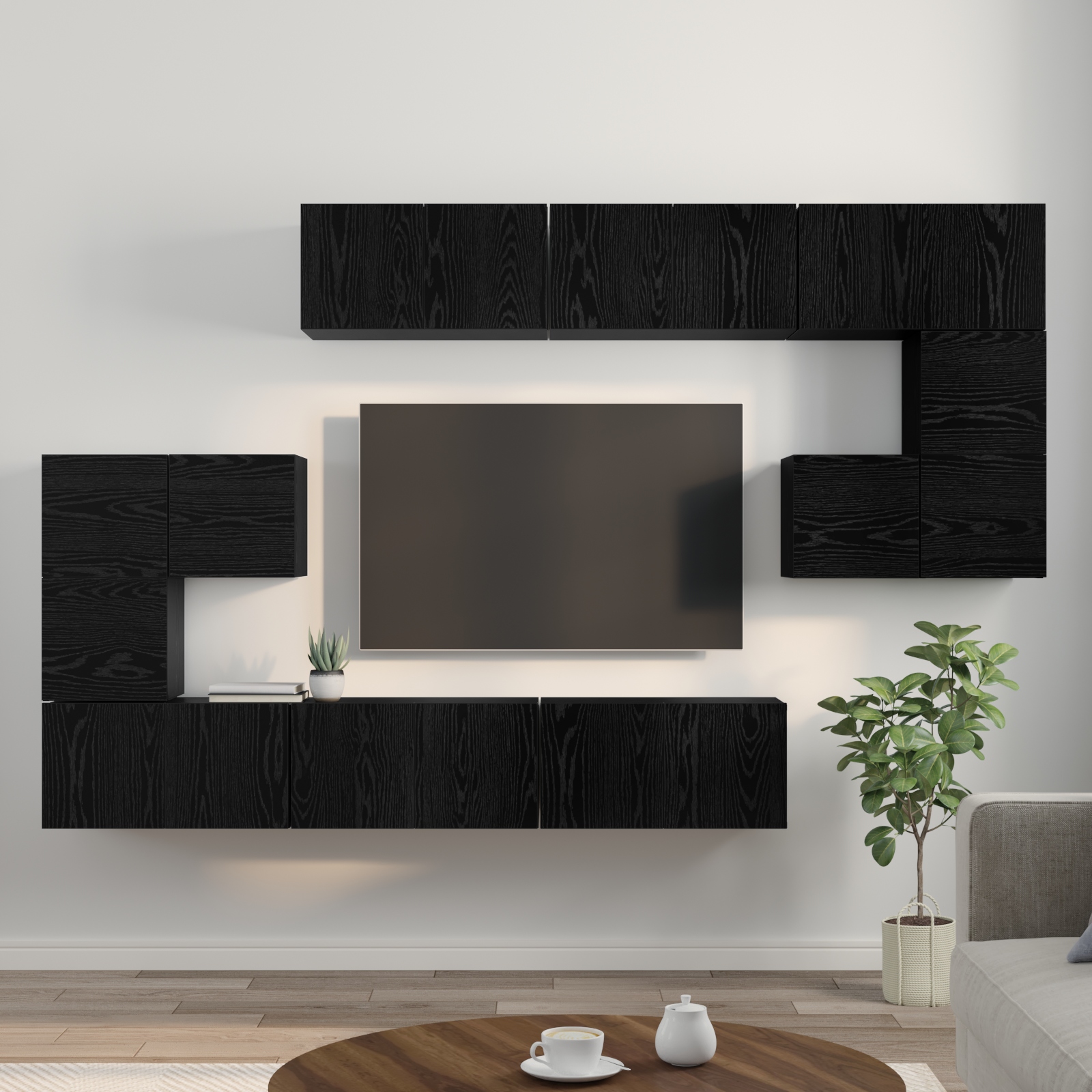 Setul ăsta de dulapuri TV, gândit să fie montat pe perete, aduce funcționalitate și un pic de stil modern în orice living. Cu un design minimalist, forma lui dreptunghiulară și liniile clare oferă o atmosferă fluidă, potrivindu-se perfect cu orice decor. Suprafața texturată adaugă un vibe plăcut, fiind locul ideal pentru întâlnirile de familie sau serile comode.