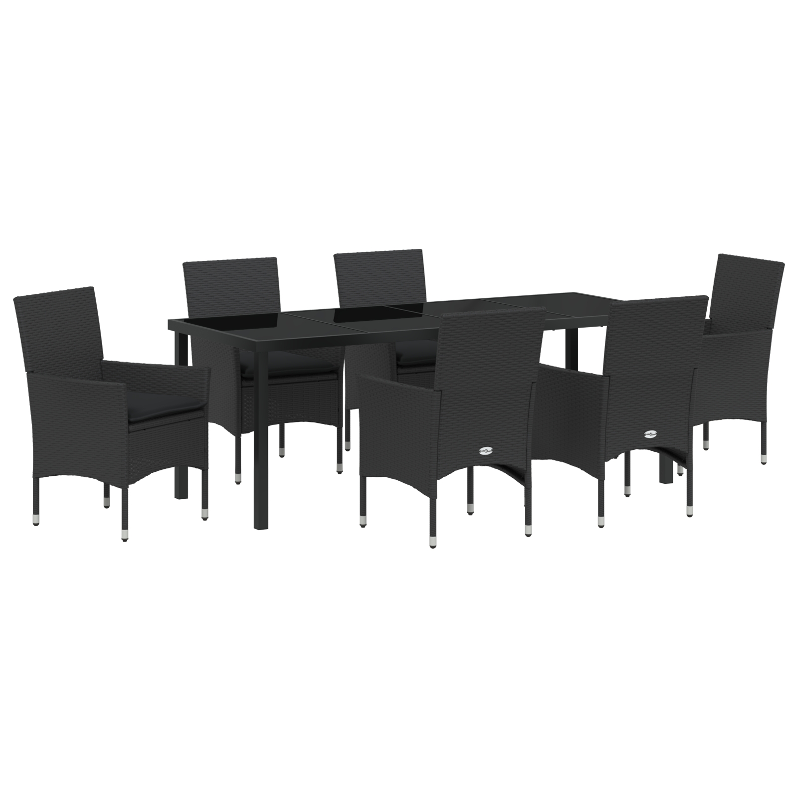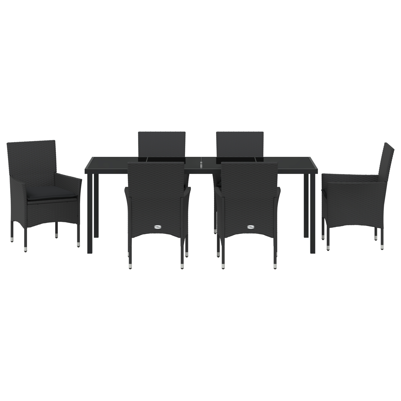Set Grădină 7 Piese cu Perne Negru Poliratan, Masă Grădină Neagră 200x80x73 cm Sticlă Temperată