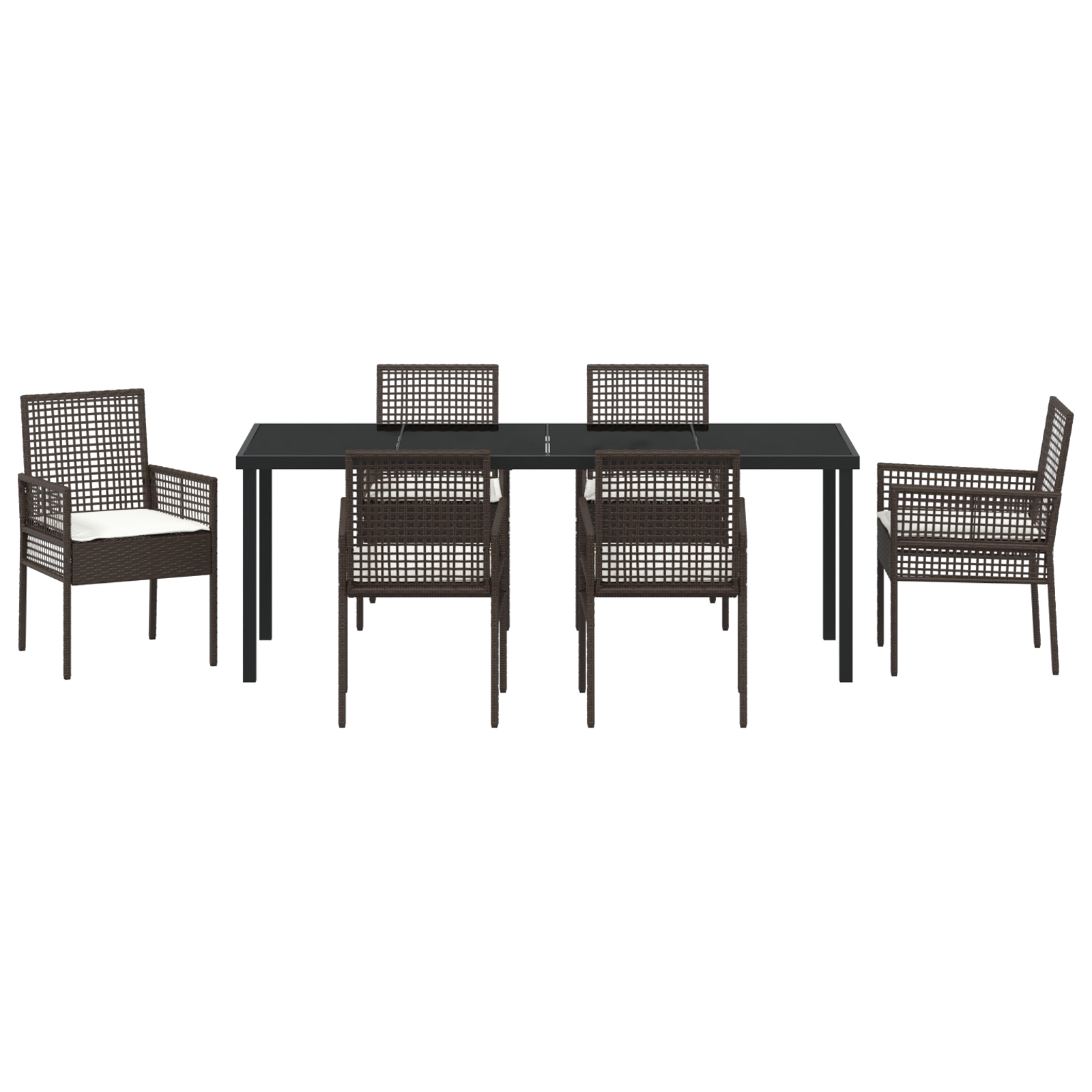 Setul ăsta de mese pentru grădină se distinge prin designul modern, creat pentru confort și stil, fiind o alegere splendidă pentru dining în aer liber. Vine cu șase scaune elegante și o masă rectangulară încăpătoare, îmbinând maronul cu crem alb, dând viață oricărui patio sau grădină.