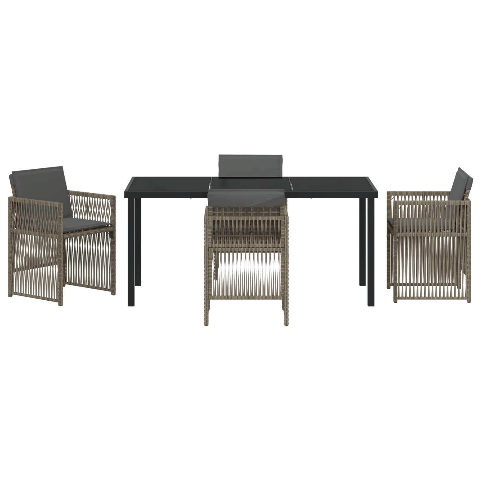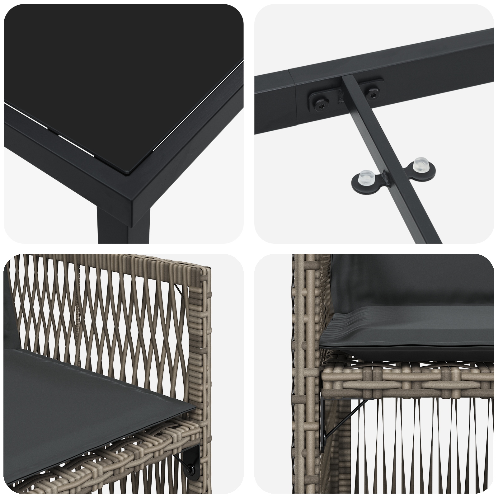 - Materiale: Setul ăsta de dining e făcut în principal din poliratan, ceea ce-i dă atât durabilitate, cât și un aspect frumos – perfect pentru exterior. Detaliile din oțel îi adaugă putere și stabilitate, așa că e gata pentru uz regulat și orice vreme.