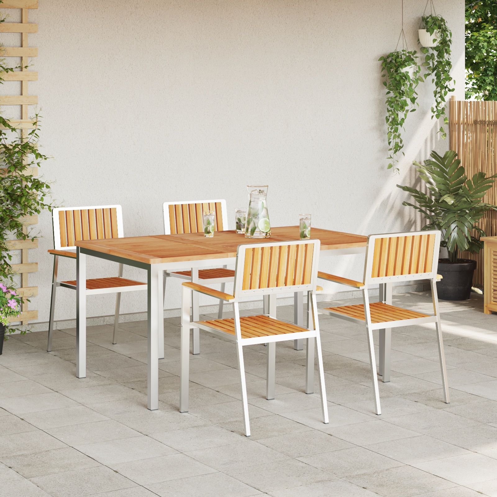 - Cadru din oțel inoxidabil: Acest set de masă pentru grădină are un cadru solid din oțel inoxidabil care îi dă stabilitate și rezistență afară. Materialul ăsta rezistă bine și în condiții umede, așa că e de încredere pentru mesele tale în aer liber. Oțelul inoxidabil arată fain și îmbină funcționalitatea cu stilul.