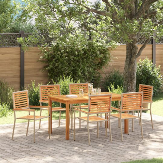 - Componente Funcționale Setul include o masă rectangulară, scaune cu șezuturi și spătare din lemn solid de acacia și brațe din poliratan, fiecare lucrat cu atenție la detalii. Aceste componente de înaltă calitate oferă confort și durabilitate, făcând din experiența de a mânca sau de a te relaxa afară una plăcută.