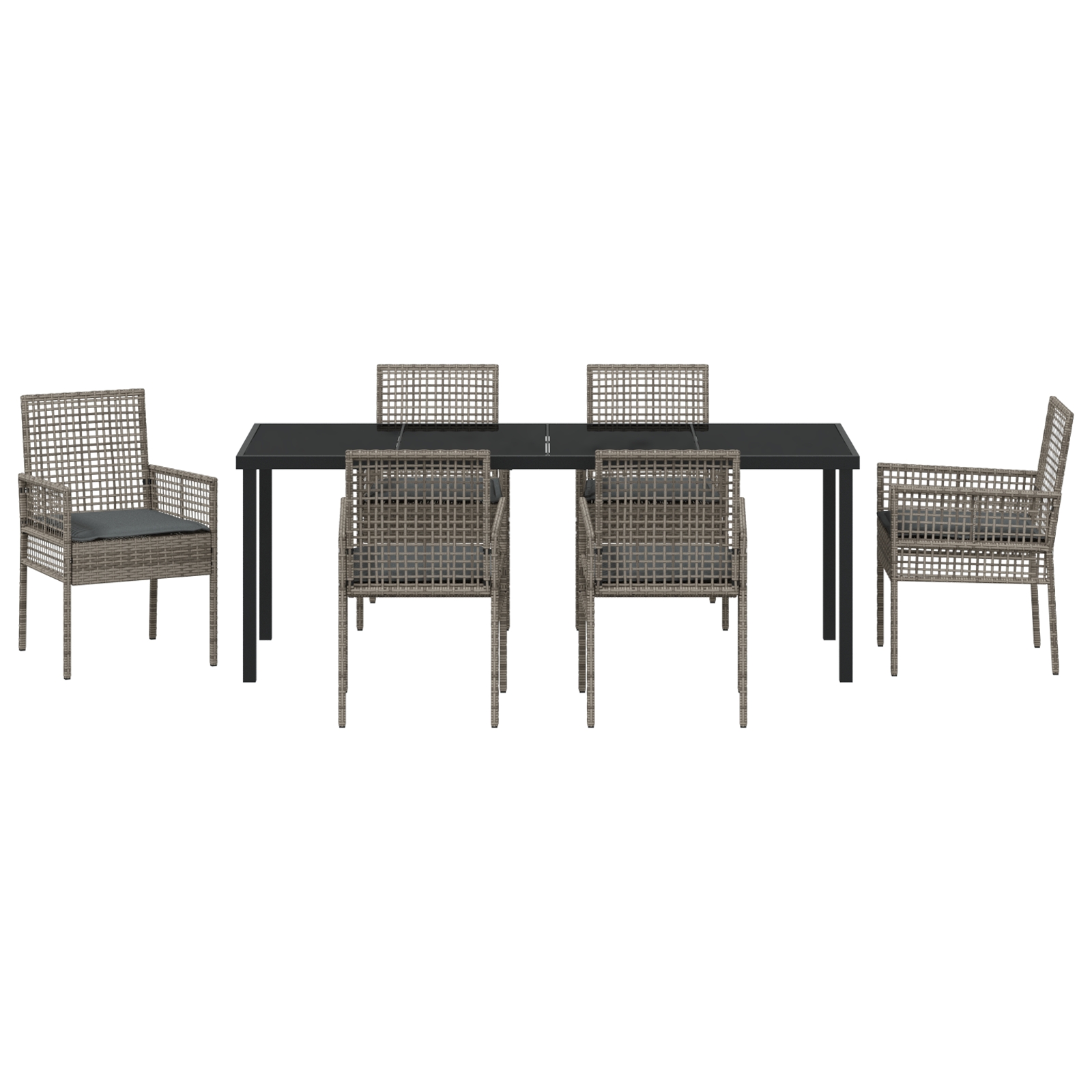 Acest set pentru grădină are un aspect modern care se concentrează pe confort și stil, fiind completarea perfectă pentru zona ta de dining în aer liber. Setul include șase scaune elegant concepute și o masă dreptunghiulară, toate într-o nuanță elegantă de gri care îmbunătățește fără efort orice terasă sau grădină.