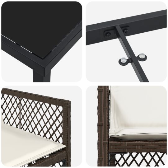 • Materiale: Setul ăsta e făcut din poliratan, deci e nu doar plăcut la vedere, dar și confortabil și rezistent la vreme rea. Cadrul de oțel solid îl face stabil și sigur, indiferent de ocazie. Poliratanul e ales pentru durabilitatea și stilul său.