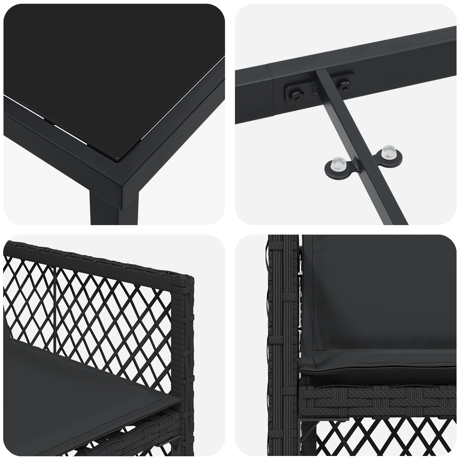 - Materiale: Setul ăsta e făcut din poliratan, deci e nu doar plăcut la vedere, dar și confortabil și rezistent la vreme rea. Cadrul de oțel solid îl face stabil și sigur, indiferent de ocazie. Poliratanul e ales pentru durabilitatea și stilul său.