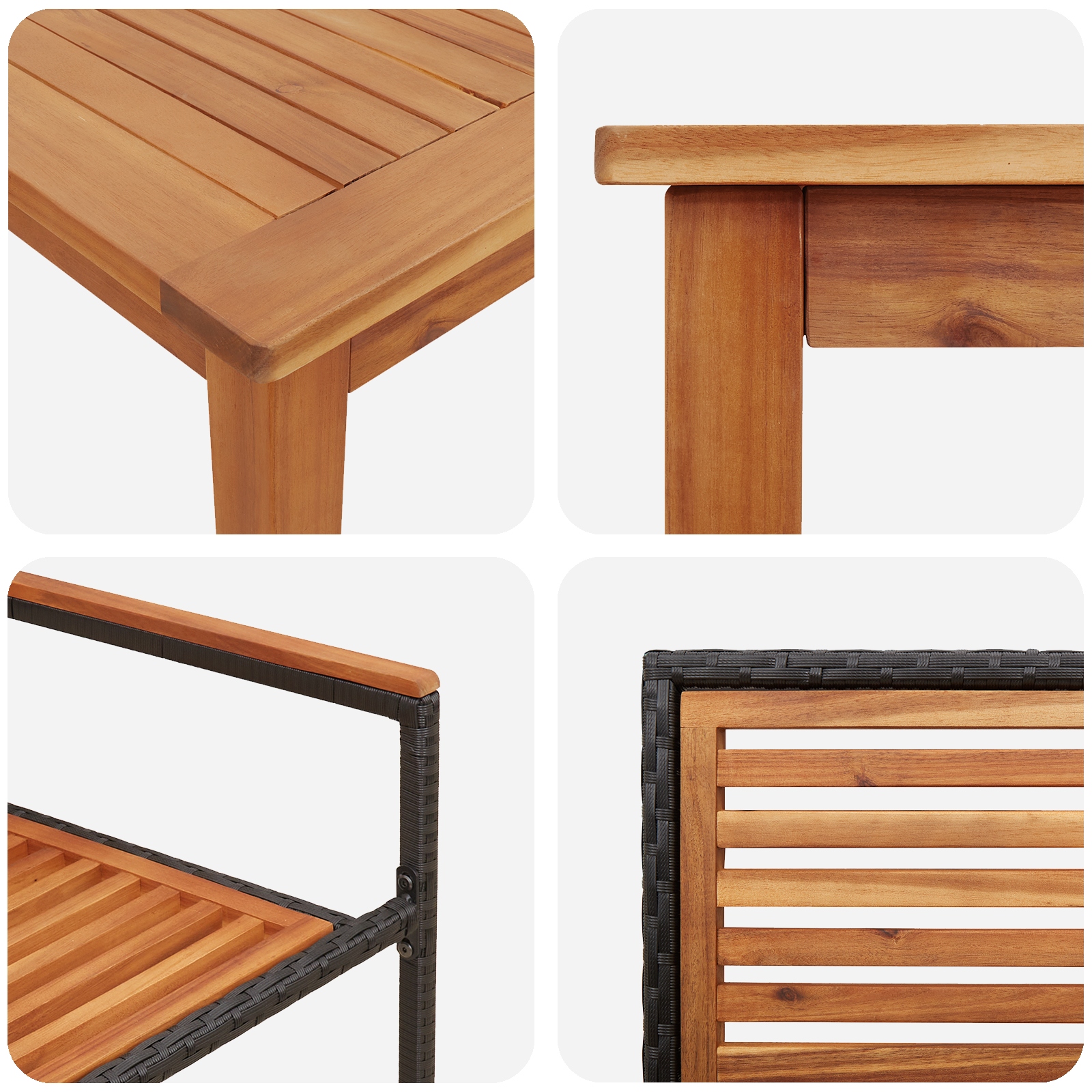 • Componente Funcționale Setul include o masă rectangulară, scaune cu șezuturi și spătare din lemn solid de acacia și brațe din poliratan, fiecare lucrat cu atenție la detalii. Aceste componente de înaltă calitate oferă confort și durabilitate, făcând din experiența de a mânca sau de a te relaxa afară una plăcută.