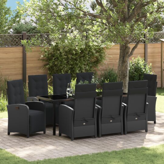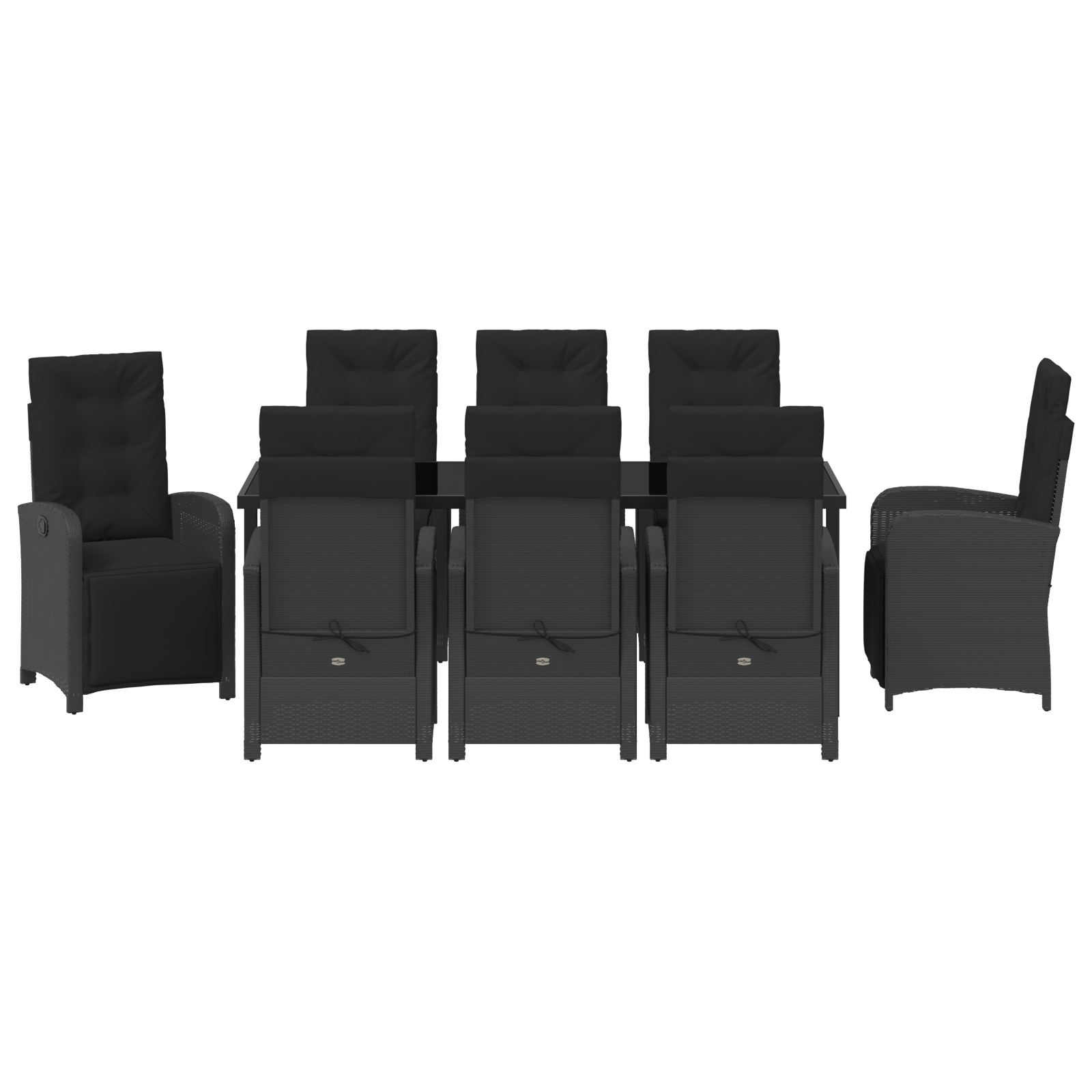 Set mese grădină cu perne Negre din Ratan Polimer, Masă grădină Neagră 200x80x73 cm din sticlă securizată