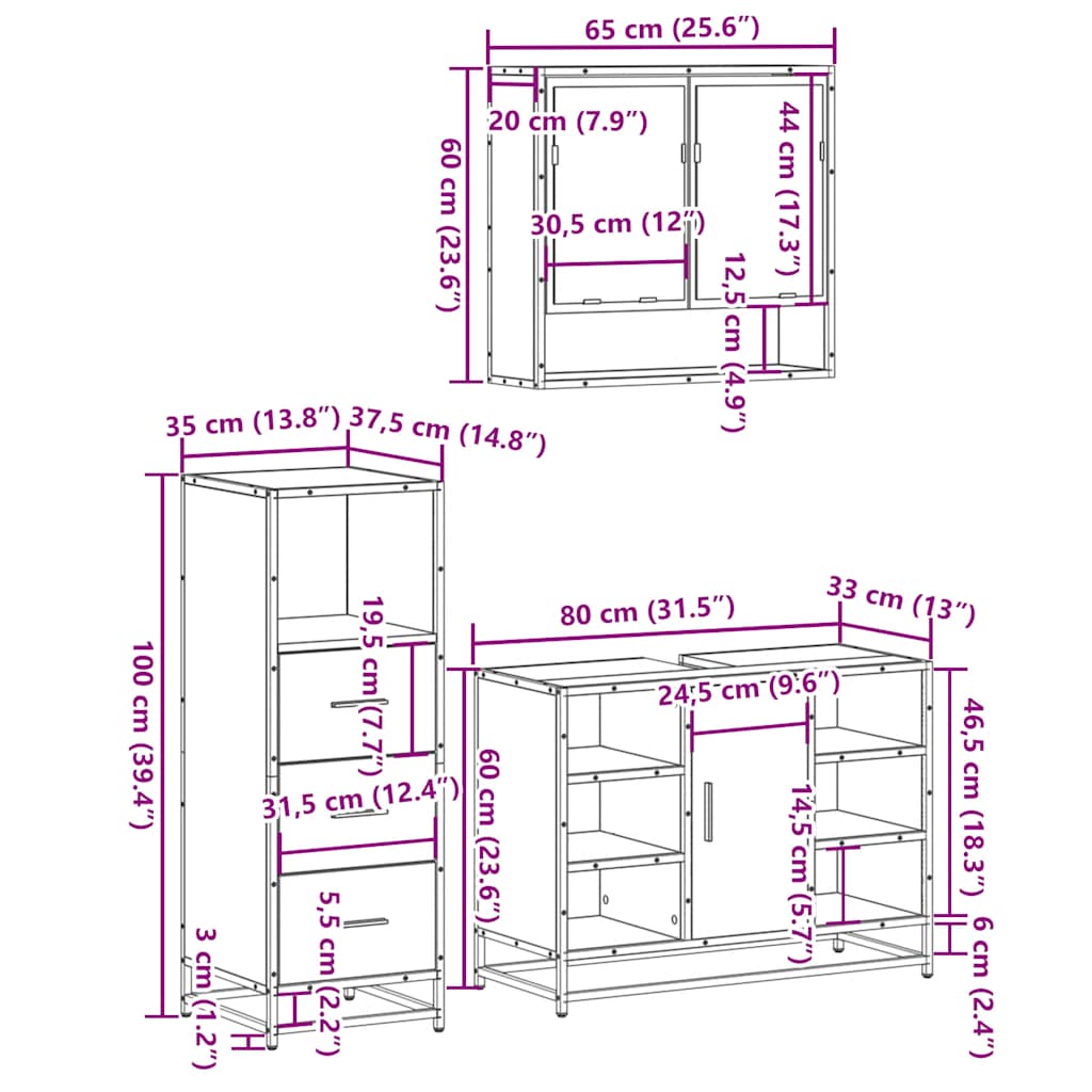 Set mobilier de baie, 3 piese, gri sonoma, lemn prelucrat
