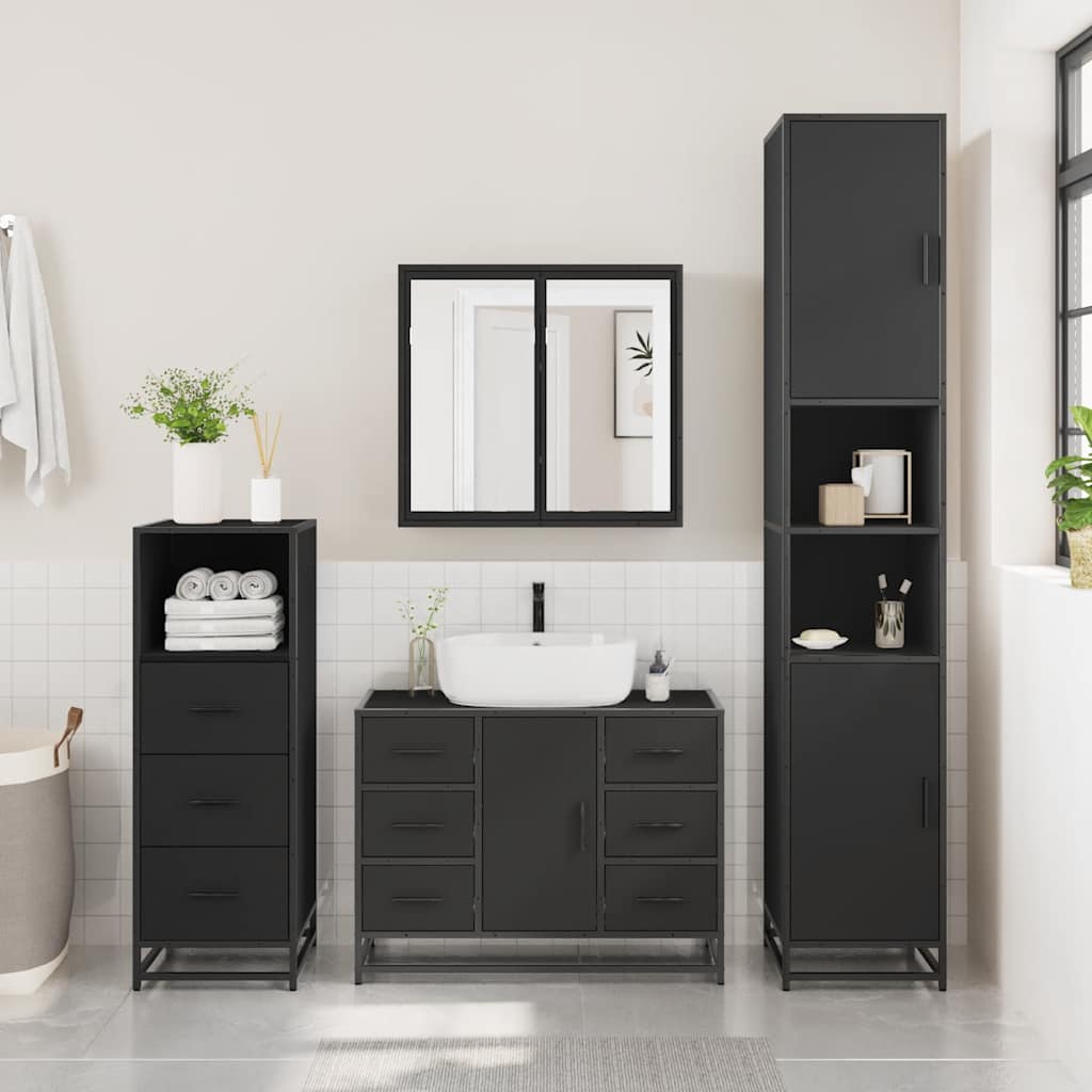 Set mobilier de baie, 3 piese, negru, lemn compozit