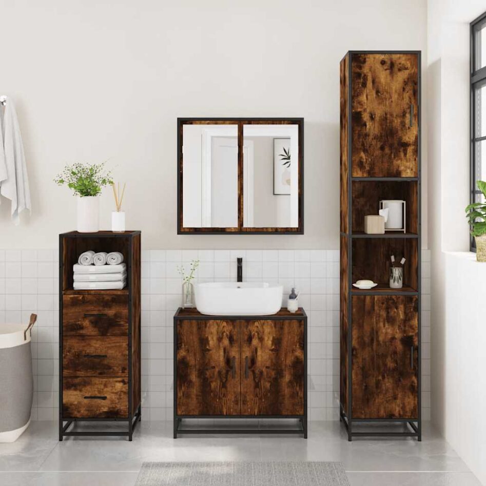 Set mobilier de baie, 3 piese, stejar fumuriu, lemn prelucrat