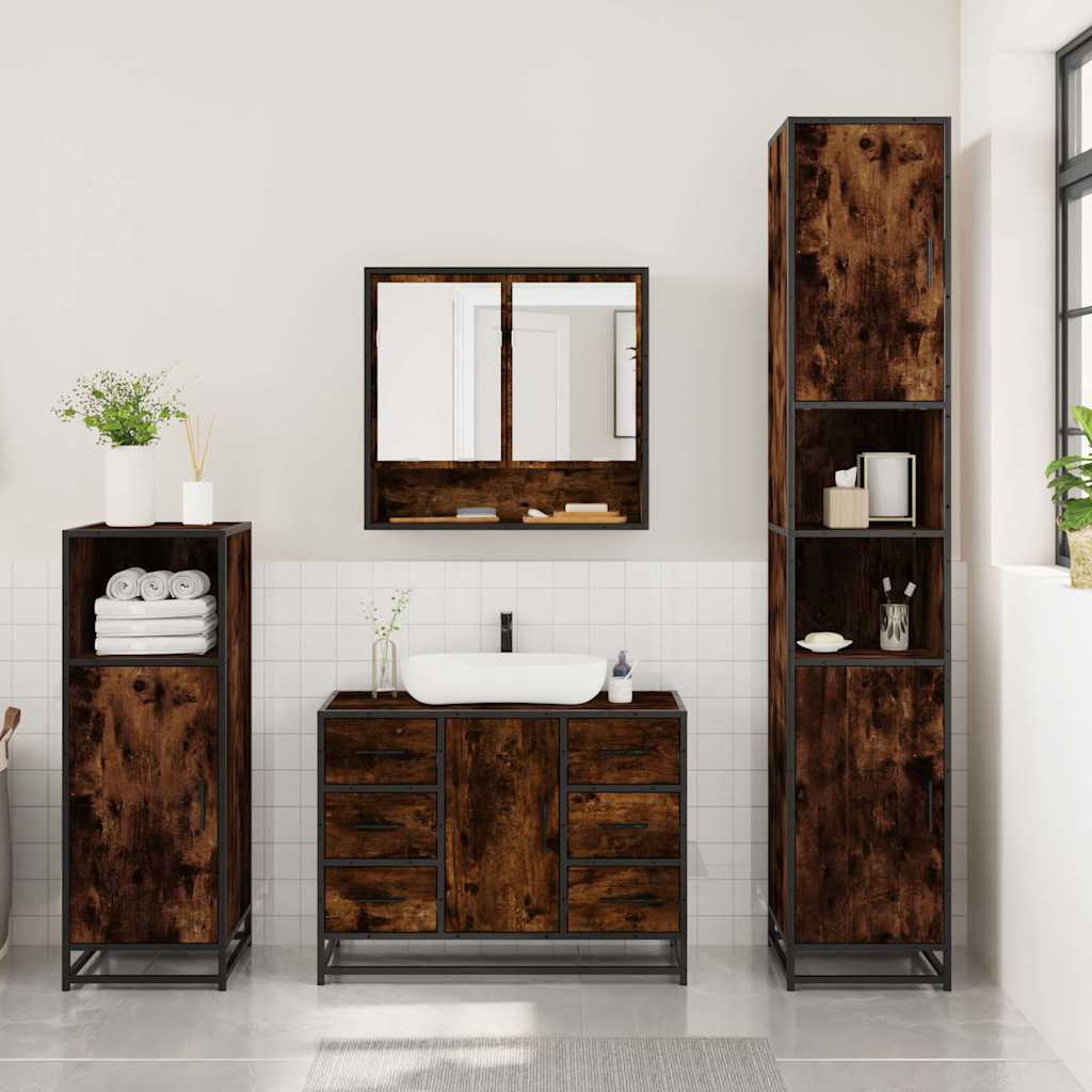 Set mobilier de baie, 3 piese, stejar fumuriu, lemn prelucrat