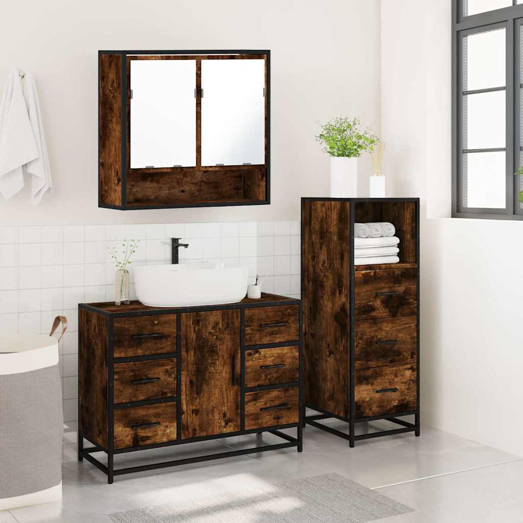 Set mobilier de baie, 3 piese, stejar fumuriu, lemn prelucrat