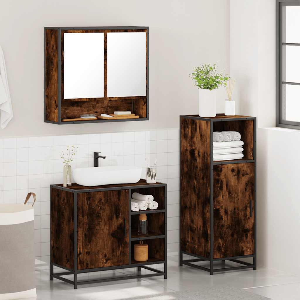 Set mobilier de baie, 3 piese, stejar fumuriu, lemn prelucrat