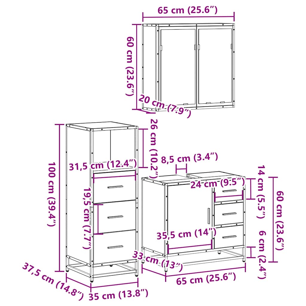 Set mobilier de baie, 3 piese, stejar maro, lemn prelucrat
