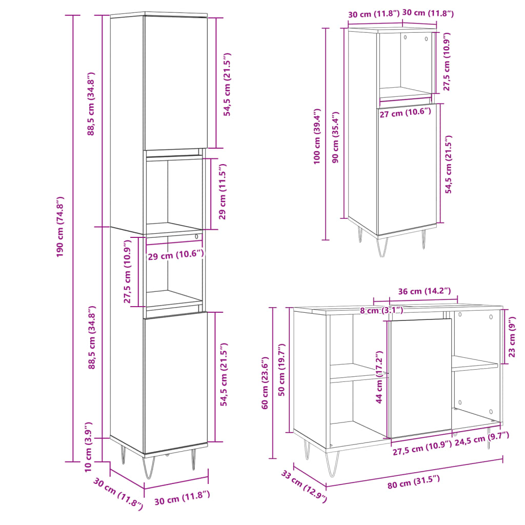 • Dimensiuni dulap de baie (L): 30 x 30 x 190 cm (l x ad. x î)