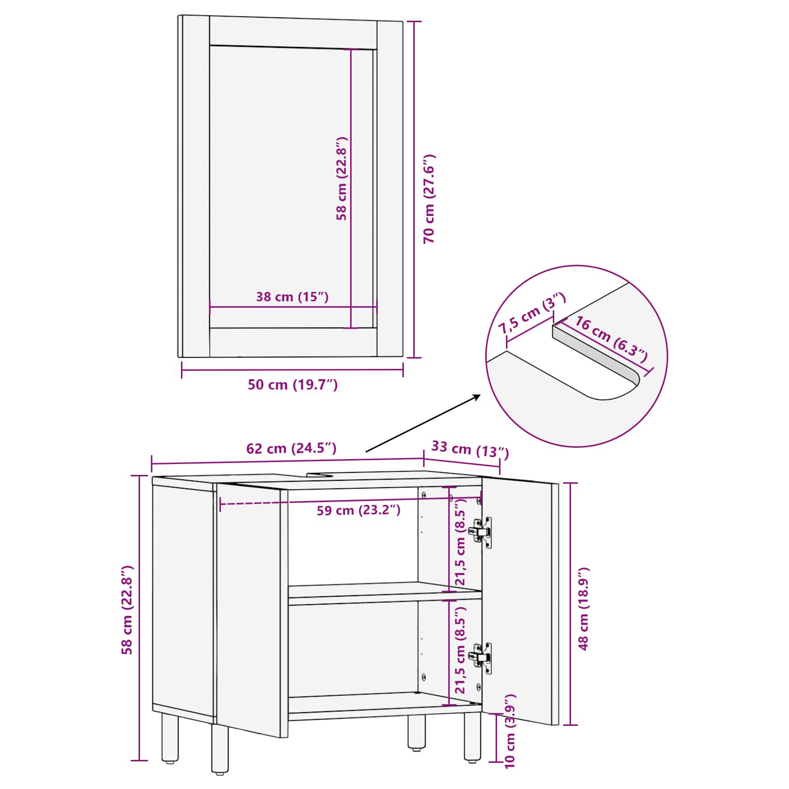 Setul nostru de baie modern îmbină simplitatea cu funcționalitatea, oferind un look elegant pentru orice baie interioară. Ideal pentru cei care caută un mediu minimalist, cu dulap pentru chiuvetă și oglindă, îmbunătățind astfel aspectul general al spațiului tău cu linii curate și fără excese. Frumusețea naturală a lemnului de mango nu doar că arată bine, ci e și un material durable în decorul băii tale.