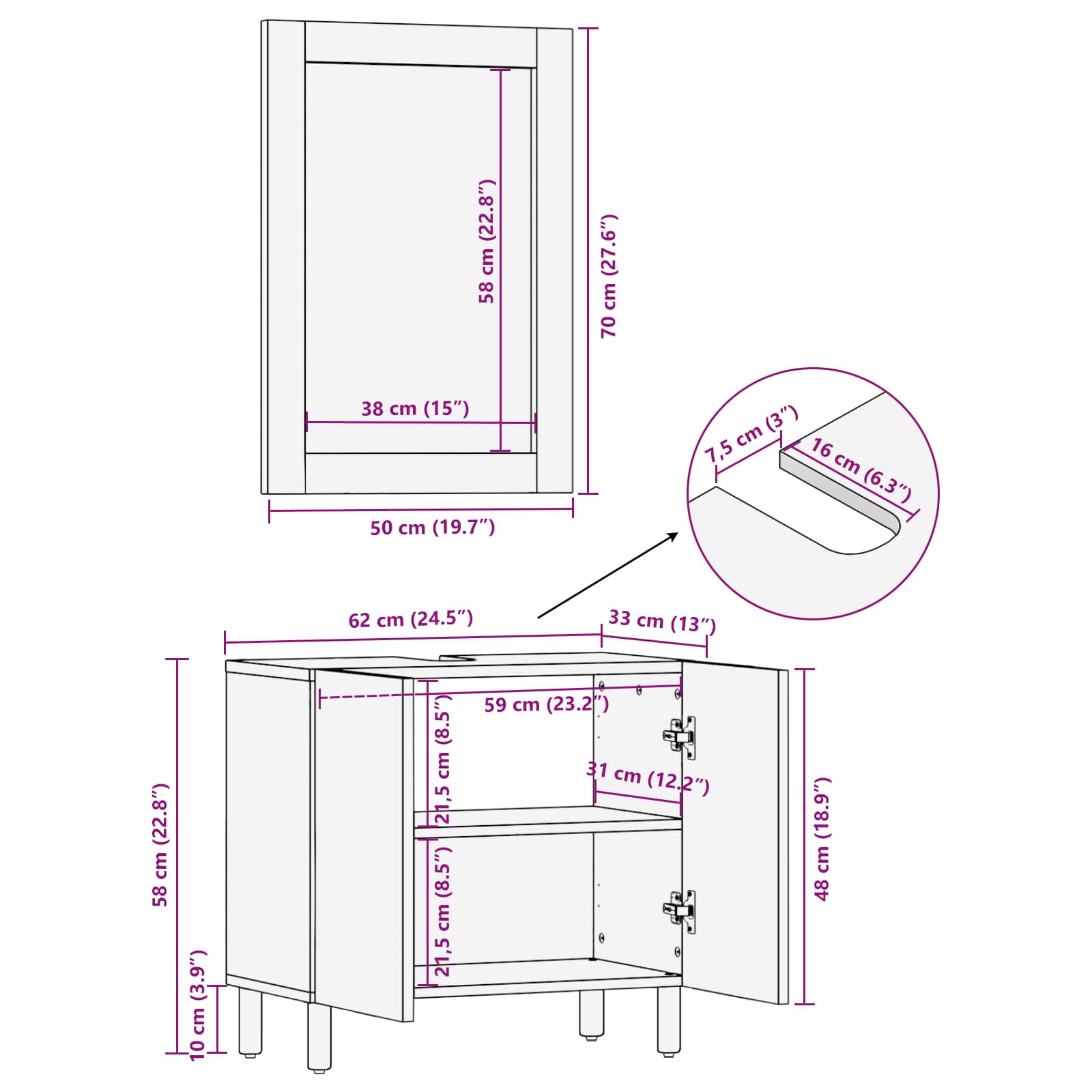 Setul nostru de baie modern îmbină simplitatea cu funcționalitatea, oferind un look elegant pentru orice baie interioară. Ideal pentru cei care caută un mediu minimalist, cu dulap pentru chiuvetă și oglindă, îmbunătățind astfel aspectul general al spațiului tău cu linii curate și fără excese. Frumusețea naturală a lemnului de mango nu doar că arată bine, ci e și un material durable în decorul băii tale.