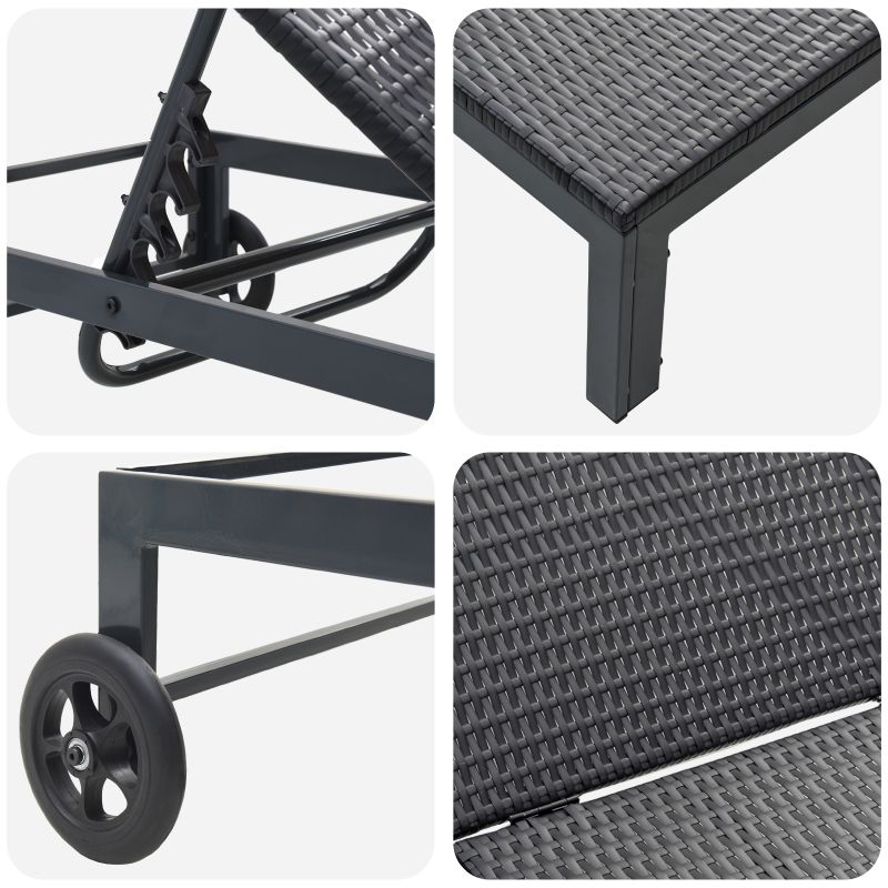 - Materiale: Fabricat din poliratan de calitate superioară, șezlongul ăsta arată bine și e rezistent la condiții meteo diverse. Cu un cadru robust din oțel, poate face față soarelui, ploii și oricăror provocări, oferind un lioc stylish pentru distracție la aer liber. Materialele alese sunt pentru confort maxim și rezistență pe tot parcursul anului.