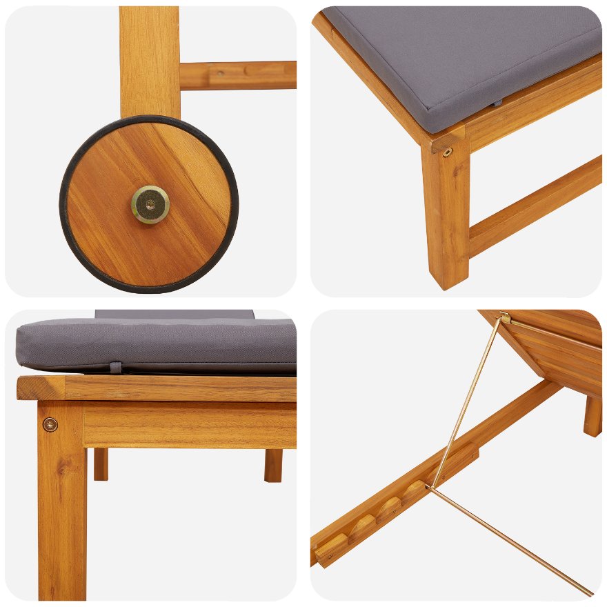 • Materiale: Fabricat din lemn masiv de acacia, acest șezlong îți oferă un loc solid și de încredere pentru a te relaxa. Acacia e rezistentă și rezistă la intemperii, așa că e perfectă pentru mobilierul de exterior. Nu doar că face șezlongul robust, dar adaugă și un farmec natural grădinii tale. Textura lemnului arată super, integrându-se perfect cu natura.