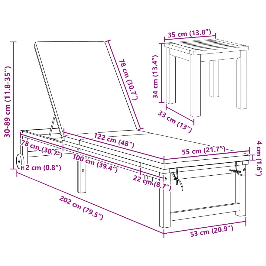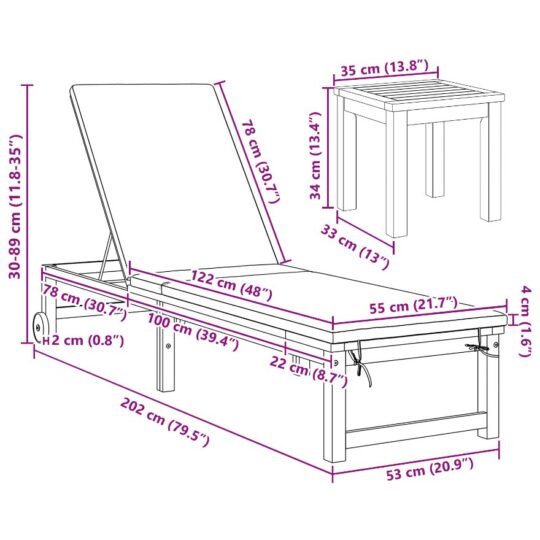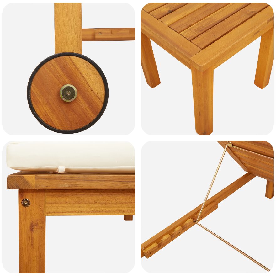 Șezlong cu masă și pernă din lemn de acacia, Șezlong cu perne crem din lemn de acacia, Masa laterală de grădină 35x35x34 cm din lemn de acacia