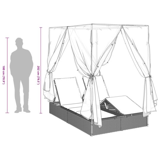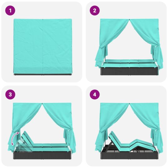 • Acest șezlong vine cu o copertină elegantă care oferă multă umbră, menținându-te răcorit în zilele calde. Draperiile frumoase creează un colț intim, perfect pentru o evadare romantică.