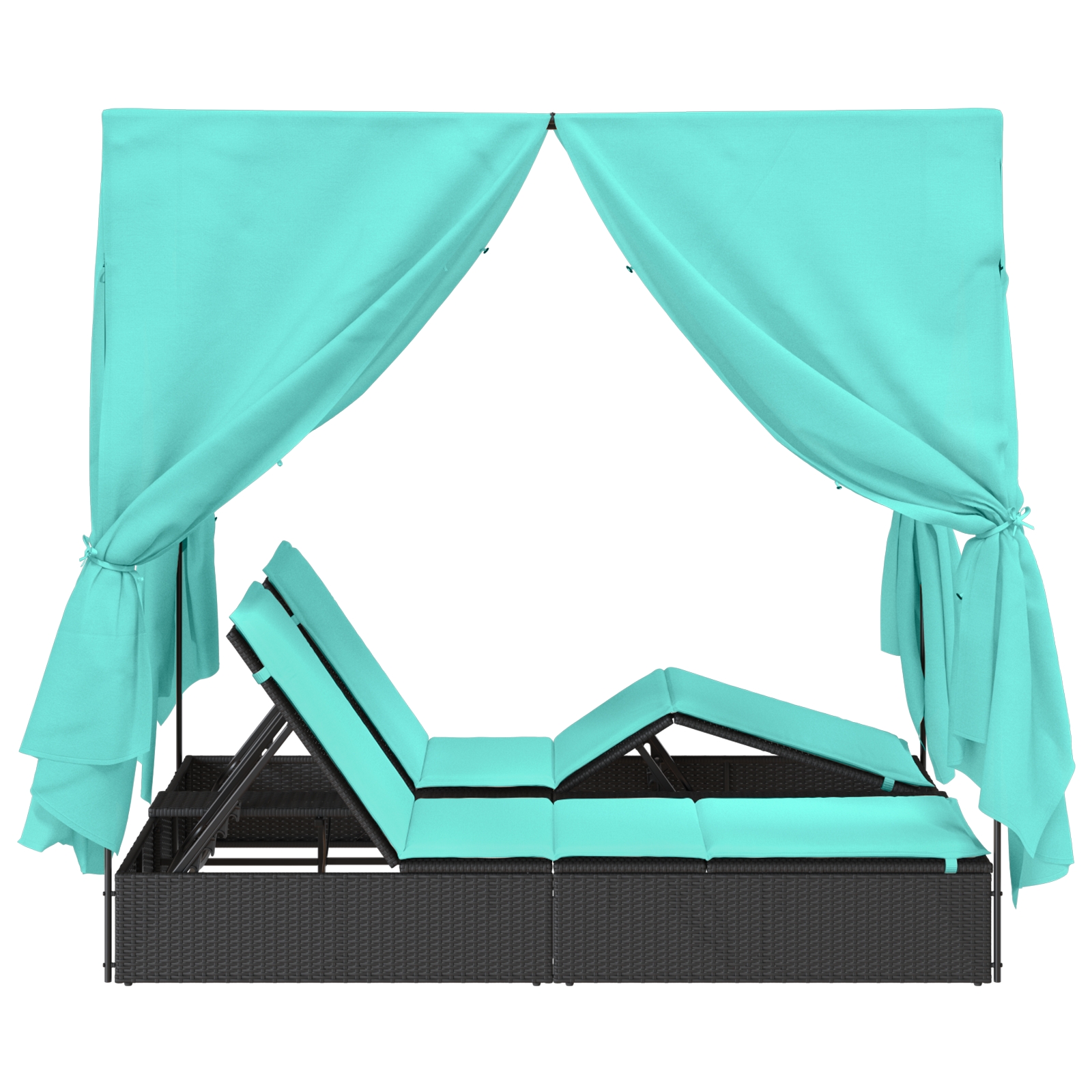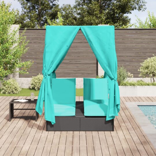 Acest pat de lounge exterior îmbină stilul cu confortul, fiind o adăugare super pentru orice grădină sau balcon. E făcut din poliratan robust, are o vibrație elegantă cu culorile negre și turcoaz, potrivindu-se bine în diverse setări exterioare — ideal pentru relaxare cu familia sau prietenii.