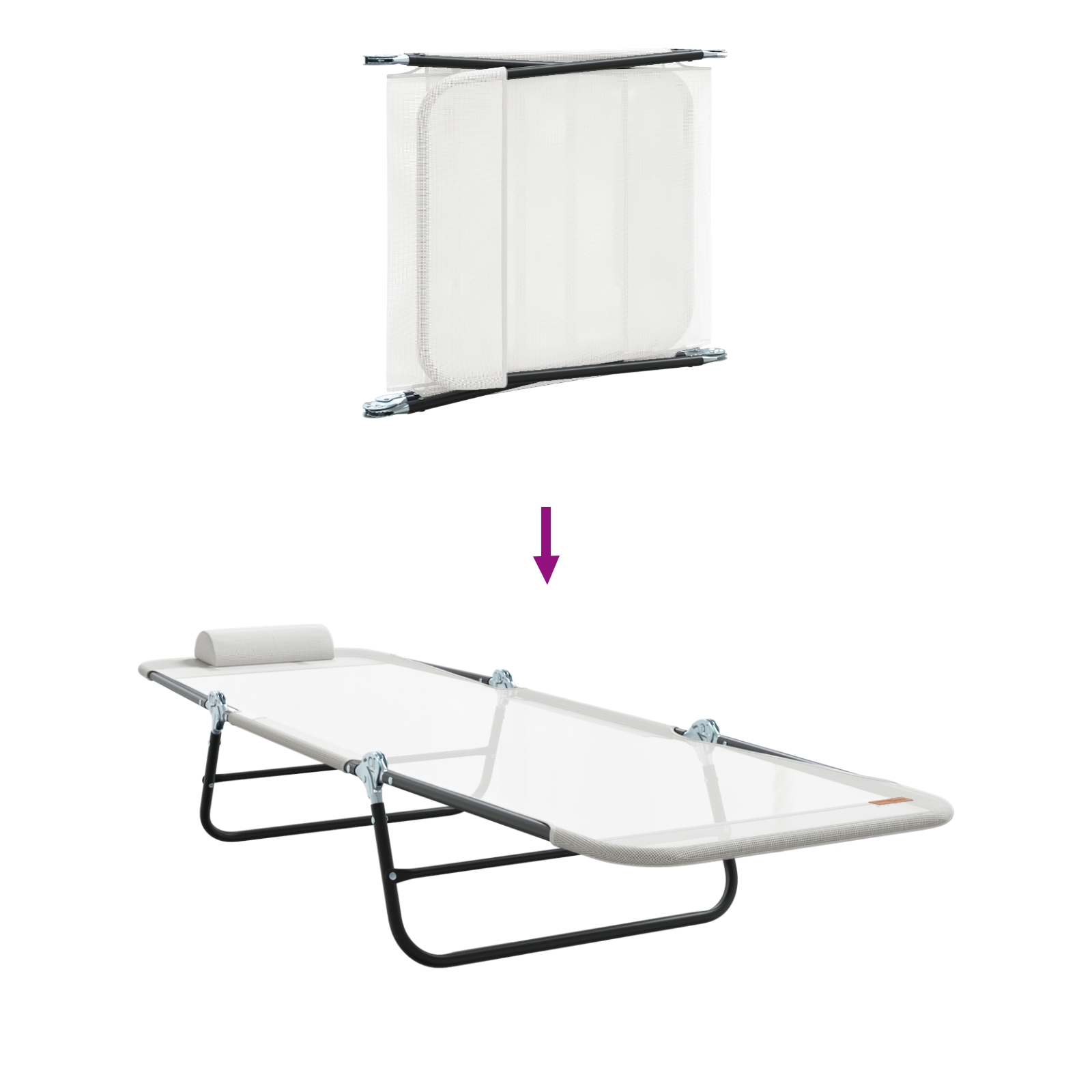 • Material Textilenă: Șezlongul e făcut dintr-o Textilenă de calitate, respirabilă și rezistentă la intemperii, perfectă pentru zile lungi afară.