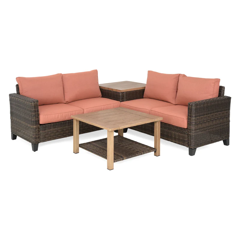 Set mobilier terasă/grădină, 2 canapele și 2 măsuțe Tilson. Servirea gustărilor pe terasa sau în grădina casei voastre se poate desfășura într-un cadru care să vă amintească de decorurile atmosferei reconfortante și elegante de stațiune. Topurile ambelor mese sunt realizate din oțel, iar masa de colț este dotată cu spațiu de depozitare pentru perne. Datorită împletiturii de fibre sintetice tratate UV și a țesăturii Olefin care îmbracă pernele și care le protejează UV și împotriva umezelii, setul din gama Tilson devine, pentru tot sezonul, centrul vostru de relaxare împreună cu familia sau prietenii.